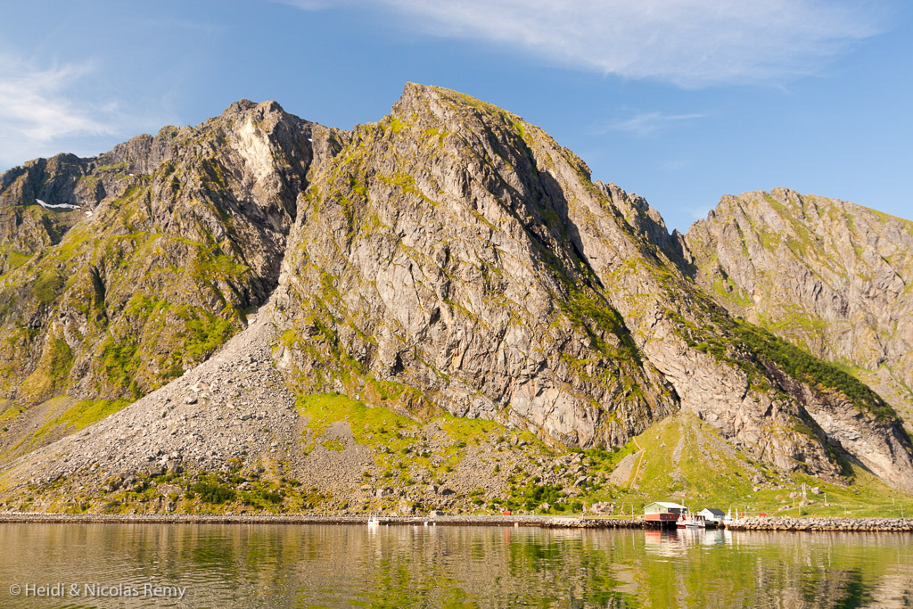 Mais sur notre parcours il ne s’agissait que d’une pause, car Flakstadøy, l’île suivante, est bien montagneuse elle aussi, sauf sur sa côte nord. C’est là que se trouvent les habitations, dans un cadre parait-il tout à fait surprenant, puisque les plages feraient penser aux Caraïbes jusqu’à ce qu’on y trempe un orteil ! De retour sur la côte sud, nous avons fait l’impasse sur Ramberg et sa côte nord pour lui préférer Nusfjord, minuscule petit port niché dans une faille. Une atmosphère intime et grandiose à la fois. Et ce d’autant plus autenthique que les infrastructures telles que fumoir à poisson, presse à huile, ainsi que bien-sûr l’ensemble des rorbuer qui entourent le port continuent de servir à chaque saison de pêche !