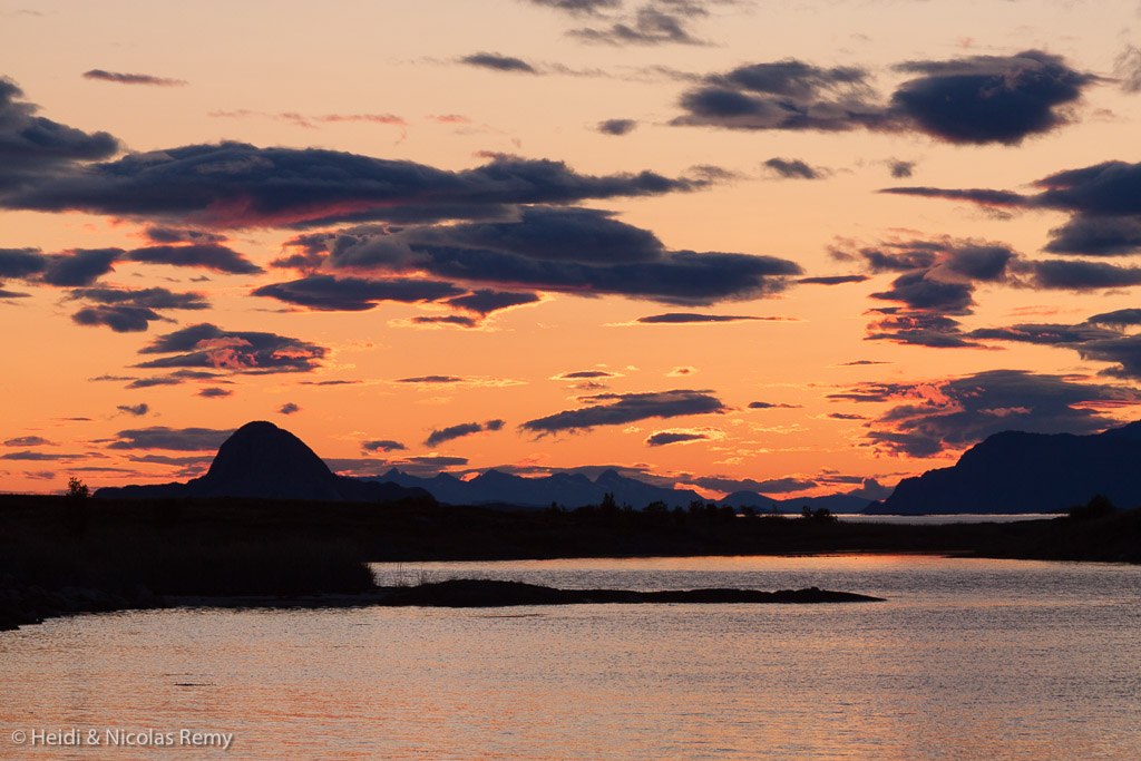 Cercle Polaire, mais ça veut dire que la nuit a cessé d’exister pour nous, n’est-ce-pas ? A la fois oui et non. C’est effectivement à partir du Cercle Polaire qu’a lieu le phénomène du “soleil de minuit”, c’est-à-dire qu’il ne se couche plus. Mais au niveau du Cercle Polaire, cela n’a lieu qu’au solstice d’été, le 22 juin. Au fur et à mesure que l’on monte en latitude, ce jour perpétuel a lieu sur une durée de plus en plus grande, pour durer finalement 6 mois au Pôle Nord (mais heureusement nous en sommes loin !) Bref, nous sommes donc trop tard en saison pour pouvoir admirer le soleil de minuit, puisqu’aux Lofoten, il se termine le 15 juillet environ. Eh non, les jours finissent toujours pour nous. Mais il y a la manière… En effet, le Soleil se couche, certes, mais pas pour longtemps ! Lorsque nous étions aux Orkney, aux Shetland ou à Bergen, il disparaissait 4 heures environ, ce qui laissait le temps à la nuit de tomber, bien qu’elle soit loin d’être noire : une lueur étrange dans le nord nous rappelait que le Soleil n’était pas loin sous l’horizon. A mesure que nous avons gagné en latitude, la durée de la nuit s’est réduite, pour n’atteindre maintenant que 2 heures environ. Autant vous dire que l’astre solaire n’est pas loin sous l’horizon et que de 22 heures à 4 heures du matin, ce n’est qu’un immense coucher de soleil qui se transforme en lever de soleil avant qu’on n’ait pu s’en aperçevoir. Il n’est donc pas tout à fait faux de dire que le jour n’en finit pas. On n’a d’ailleurs pas vu d’étoiles depuis début juin, et on ne sait plus très bien ce qu’est une nuit noire… C’est très pratique au mouillage lorsqu’on se demande si l’ancre tient bien !