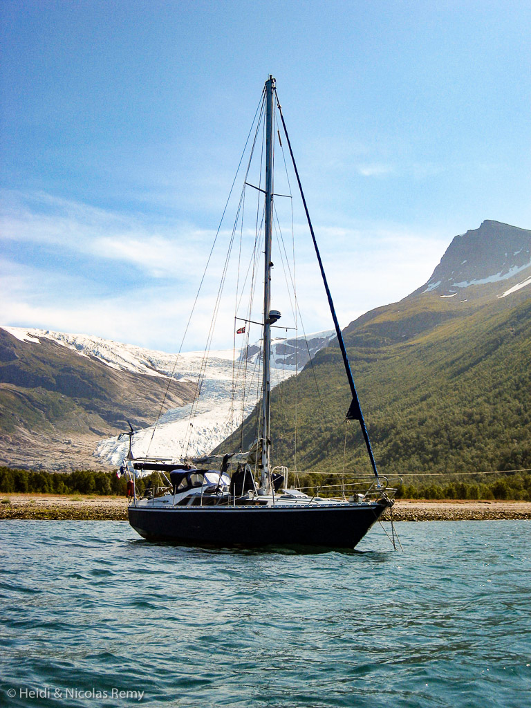 Je terminerai enfin ce long récit sur l’ascension de la face nord-ouest de la Norvège en vous relatant notre première expérience arctique. Juste au-dessus du fameux cercle, tout juste à l’intérieur des terres, se trouve la deuxième plus grande calotte glacière d’Europe, le Svartisen, ce qui signifie Glacier Noir (la plus grande, le Jostedal, se situe aussi en Norvège, plus au sud). Nous avons eu la chance de pouvoir mouiller Fleur de Sel à Engen, devant le glacier. Plusieurs langues “coulent” de la calotte, et deux d’entre elles aboutissent non loin de la mer. Le seigneur Svartisen ayant daigné nous saluer en se découvrant (de son chapeau de nuages), nous en avons profité et en un peu plus d’une heure de marche, nous avons atteint le front de glace que l’on voyait du bateau, le tout vers 22 heures passées, à la lumière du soleil couchant… Autant dire que c’était féérique, impressionnant et stressant à la fois. En effet, le lendemain matin, un vent frais soufflant de l’ouest venait rebaigner le glacier dans ses nuées, tandis que nous étions forcés de déguerpir sans attendre notre reste. Mais quelle expérience que de venir mettre son voilier à l’ancre presque au pied d’un glacier ! C’est ainsi que nous attaquons la partie arctique de notre voyage et cela nous semble de bon augure pour la suite !