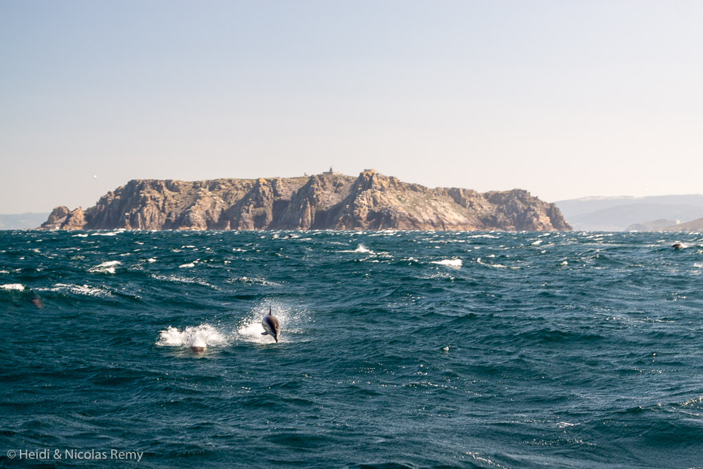Heureusement le soleil brille, la mer s’est déjà notablement réchauffée (12°C) et les cabrioles des dauphins et des fous de Bassans autour de Fleur de Sel dans une mer agitée mais poissoneuse, nous donnent le sourire. Néanmoins, nous ne nous éternisons pas, car le vent doit tourner bientôt. Fleur de Sel surfe donc sur la houle, et atteindra sans encombre les Rias Baixas en milieu de nuit.