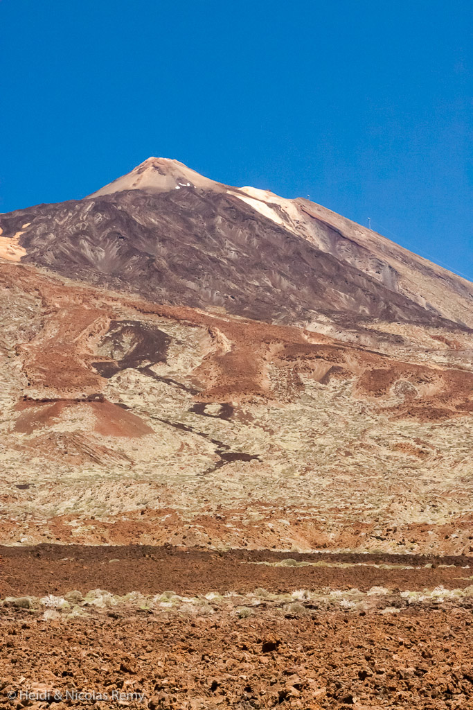 Ténérife, c’est la plus grande, en taille et en hauteur. Et pourtant, en raison du temps nuageux notre regard ne sera pas monopolisé par le Teide, resté pudique. A notre départ en voiture, il semble d’ailleurs toujours être caché. Pourtant, ce n’est pas chose facile de dissimuler un volcan de 3’700 mètres ! Du large, il semble surgir des flots, et s’il n’y avait pas d’océan, il mesurerait plus de 7’000 mètres au-dessus des fonds marins… Ca donne le tournis rien que d’y penser. Rien que d’y monter aussi, d’ailleurs, car la route est loin d’être droite. Nous nous appliquons donc à bien négocier les virages, car ça fait plusieurs mois que nous n’avons pas conduit ! Arrivés à Vilaflor, le plus haut village d’Espagne, un espoir renaît sous la forme d’un coin de ciel bleu, qui prend le dessus quelques centaines de mètres plus haut. Nous voici au-dessus de cette fameuse inversion, dans la couche d’air sec, et nous admirons alors dans toute leur splendeur Las Cañadas et El Teide, un gigantesque cratère volcanique de 50 km de circonférence au milieu duquel surgit le plus haut pic d’Espagne. Le tout dans des teintes noires, jaunes, ocre, et parfois vert, sous un soleil de plomb. Un désert de lave, de sable, de roches, où poussent quelques tajinastes rojos, ces gigantesques fleurs côniques rouges.