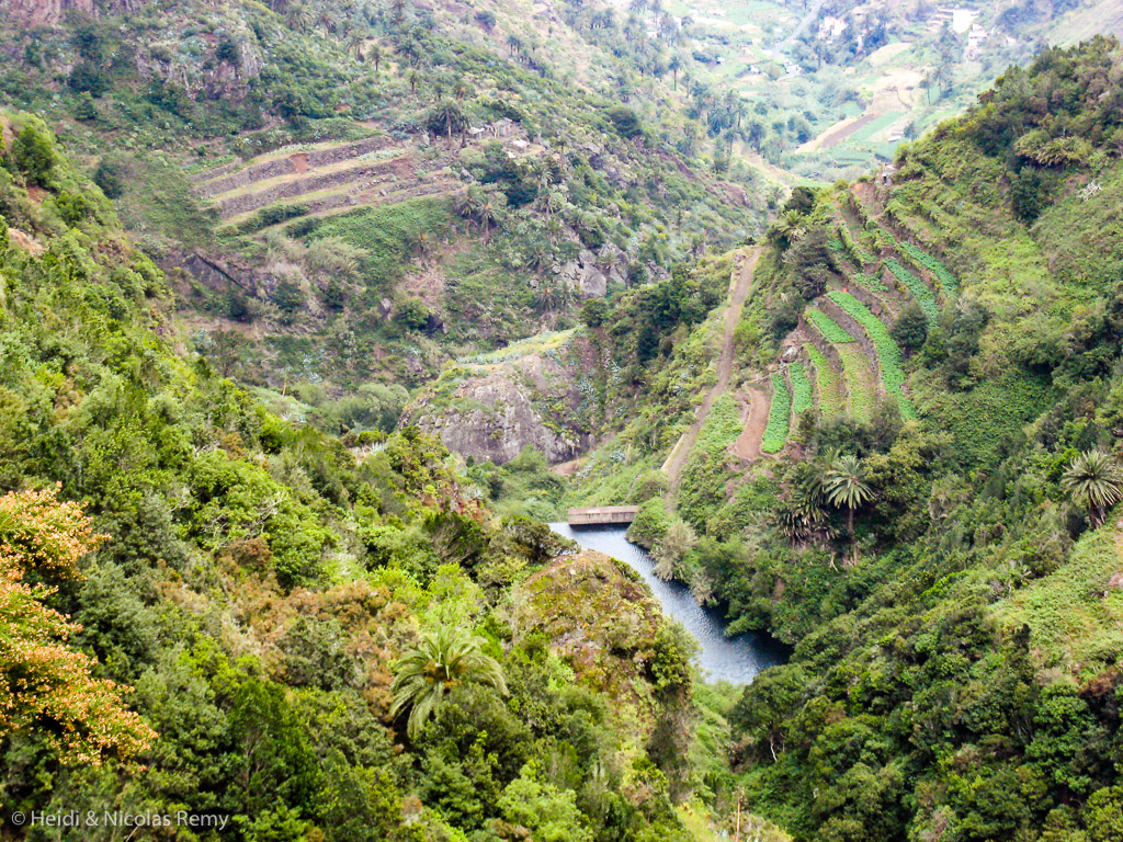 La ville est charmante, ni trop grande, ni trop petite. On y trouve de quoi bien ravitailler avant de partir vers le Cap-Vert où on ne trouve plus grand’chose. Et puis le colis que nous attendons semble coincé à Madrid. Cette fois-ci c’est un islandais qui vient mettre son grain de cendre, puisqu’on nous dit que le volcan Eyjafjöll a entrainé la fermeture des aéroports canariens. Pas grave, l’île regorge de randonnées plus superbes les unes que les autres. Nous nous faisons donc déposer en bus non loin du Garajonay, le sommet de l’île, pour nous balader dans la laurisylve, et descendre vers la côte nord. Le paysage est beau, nous poursuivons notre randonnée malgré la fatigue, et nous nous retrouvons à descendre une paroi presque verticale sur un petit chemin étroit en longeant une cascade d’une hauteur respectable. Bilan de la journée : nous en avons pris plein les yeux, et plein les genoux aussi !
