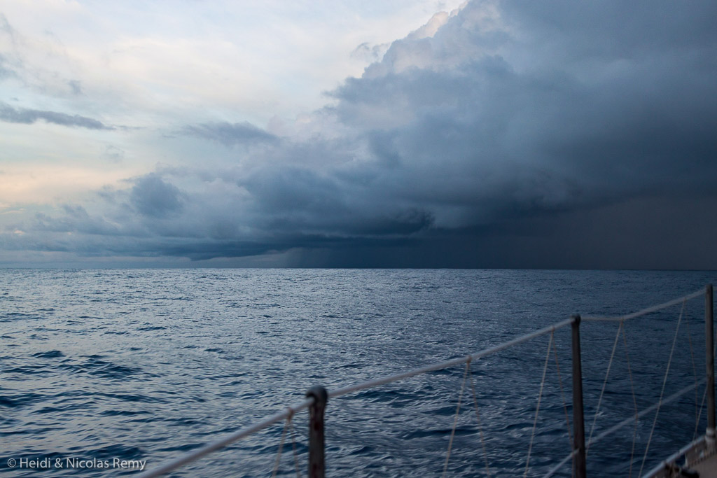 Cette nuit-là, après deux jours de moteur, nous commencions sérieusement à nous demander jusqu’où s’étendait la ZCIT, espérant qu’elle ne nous suivrait pas trop loin vers le sud dans ses ondulations quotidiennes. En tous les cas, nous étions bien dedans, puisque le ciel s’était bien chargé et assombri à la tombée de la nuit. Tout en surveillant au radar le déplacement des grains, on ouvre les panneaux de pont quand il ne pleut pas pour les refermer quelques minutes plus tard au risque d’avoir la douche directement dans le bateau. C’est qu’il fait chaud, et qu’on suffoque vite dans cette torpeur humide. Et crac, pourtant nous n’allons pas trop vite, mais nous venons de nous faire flasher. Et re-crac ! C’est confirmé, il y a bien de l’orage dans l’air. Suivent quelques heures à slalomer entre les grains, alors que les éclairs illuminent le ciel d’encre d’un côté, de l’autre, et ailleurs encore. On n’est jamais très rassuré lorsqu’on entend le roulement du tonnerre en mer.