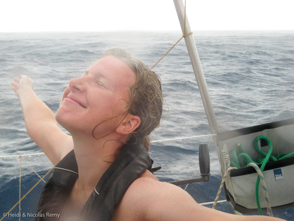 Tout a commencé 3 jours après avoir quitté Brava. Le vent mollissant devenait irrégulier, et le ciel s’est progressivement chargé d’humidité. Tant et si bien que nous nous sommes fait surprendre par une sensation étrange : des gouttes de pluie, chose que nous n’avions plus vue depuis fin mars en arrivant au Portugal ! Après cette séquence vaporisateur, la deuxième averse fut un déluge. Fleur de Sel s’est fait rincer et nous avons fait de même, profitant de cette douche gratuite ! En fait, la dépression que nous redoutions a accéléré et s’est évaporée, pour n’être qu’une petite onde tropicale, et en quelques heures c’était réglé. Le ciel n’était plus du tout le même, lavé de son sable en suspension. Fini les couchers de soleil jaunâtres, on retrouve toute la palette des couleurs. On revoit une multitude d’étoiles la nuit. Nous avons le sentiment d’être passés de l’autre côté de quelque chose.