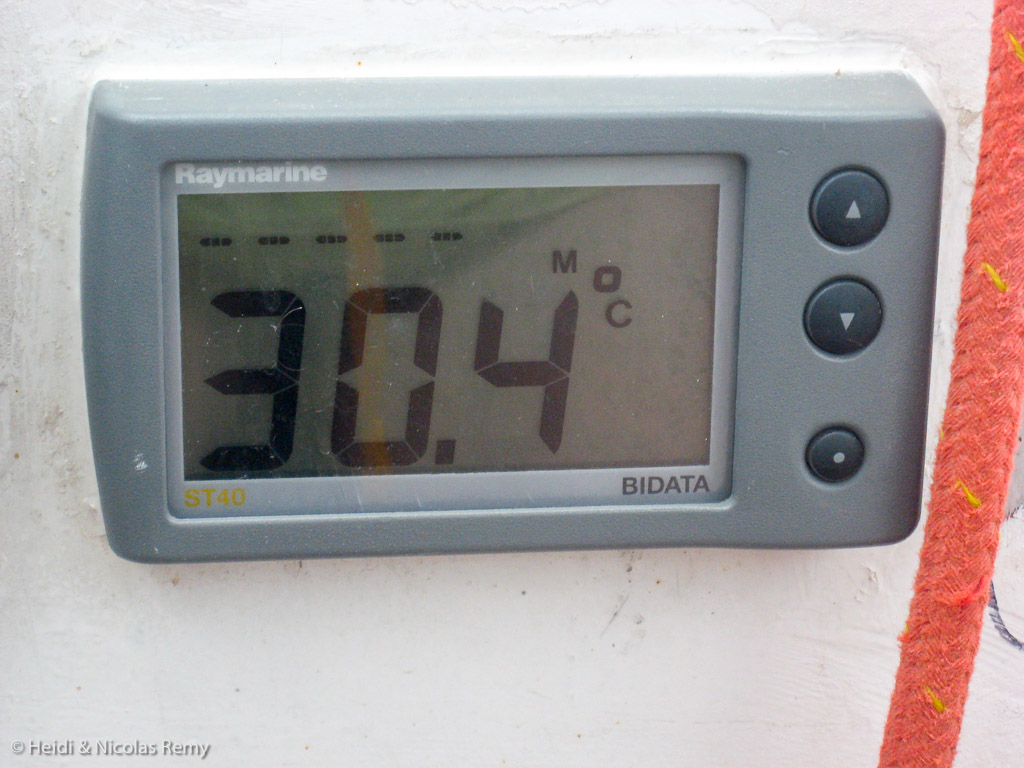 Sixième jour de mer, et pas plus de vent que la veille. Nous continuons donc au son du ronronnement Yanmar, qui se trouve providentiellement épaulé dans sa propulsion par un courant d’un nœud nous portant au sud. Sorti d’on ne sait où, ce n’est pas grave, il est le bienvenu, et nous aide à égrener les degrés de latitude. 8° la veille, ce sont aujourd’hui les 7ème et 6ème parallèles que nous franchissons, alors que les grains continuent de nous passer une fois devant, une fois derrière, une fois dessus… Par endroits, la mer est calme, à d’autres des vagues ballotent le bateau sans qu’on ne sache très bien d’où elles viennent. Un peu chaotique cette masse d’eau. En tout cas, elle est chaude, le thermomètre ayant atteint 31,4° !