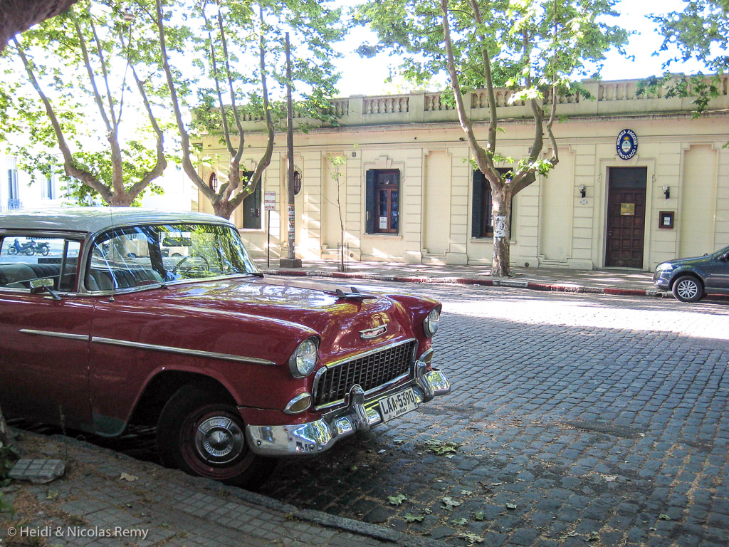 Joli spectacle, avant d’arriver dans la non moins jolie petite citée de Colonia del Sacramento, simplement Colonia pour les intimes. Des ruelles pavées et ombragées, de jolies maisons et des places pleines de charme, l’escale est agréable. L’extrémité ouest de la ville, aux ruelles irrégulièrement imbriquées, est due aux Portugais, la partie orientale, quadrillée comme un damier aux Espagnols. La ville a changé de main sept fois au cours de son histoire, alternant entre influence espagnole et portugaise, puis entre argentine et brésilienne pour finalement faire partie du petit pays qu’est l’Uruguay. C’est l’occasion de dire adieu à cette contrée attachante par sa tranquillité et sa nonchalance. Nous resteront des images de gens assis sur un banc et sirotant leur maté avec leur bombilla (paille filtrante en argent), de bœuf servi grillé (parilla) ou en sandwich (chivito), ou encore de vieilles voitures.