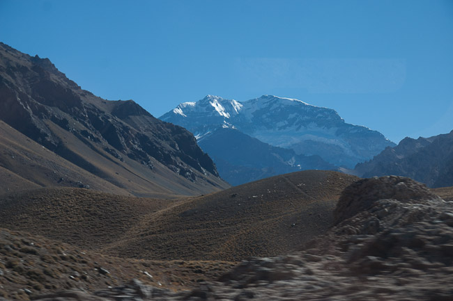 Samedi 14 mai – Embarquement à bord du bus international à destination de Mendoza. Nous quittons Santiago (520m d’altitude) pour assez rapidement nous engager dans une ascension relativement douce au début, bien qu’on sente que le moteur du bus donne de la puissance. Mais après, la végétation subtropicale fait place à un paysage de montagne qui devient sévère et spectaculaire, au fur et à mesure que l’on grimpe une série de lacets impressionnants. Les camions sont nombreux et la route est excellente car il s’agit de la principale liaison Argentine-Chili. Nous frayons désormais notre passage entre des parois de roches ignées que l’on sent tout droit sorties du centre de la terre. Le col de Los Libertadores est à 3’500m, mais nous empruntons un tunnel creusé en contrebas à 3’175m pour déboucher du côté argentin. C’est alors que le temps d’un instant une perspective s’ouvre au nord sur l’Aconcagua, le toit des Amériques, qui culmine à tout juste moins de 7’000m. A cette saison, il est à peine couvert de neige, et pour cause, le paysage qui nous entoure est d’une aridité certaine. Ont alors lieu les formalités. Après quelques tampons supplémentaires dans le passeport et un contrôle des bagages fantaisiste (nous voici de retour en Argentine…), nous entamons la descente, plus douce et progressive de ce côté-ci, pour arriver à 750m d’altitude dans l’après-midi. Nous sommes en pleine région viticole, et avant tout du Malbec, mais là n’est pas le but de notre visite. Aussi, après un petit tour dans le centre-ville de Mendoza, la principale cité de l’ouest argentin mais qui ne nous fait pas grande impression, nous voici de nouveau dans un bus cap au nord.