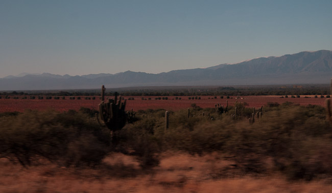 Dimanche 15 mai – Après une route de nuit un peu mouvementée par le ronflement du voisin ou encore les pleurs du bébé de la voisine, nous arrivons quelque peu groggys à Tucumán, San Miguel de son prénom, grande ville du nord-ouest argentin, où il fait un temps maussade. Bien que nous voyageons depuis 24 heures, nous ne sommes pas en reste, et c’est un troisième bus d’affilée que nous attrapons. Nous allons cette fois-ci remonter vers la cordillère, car nous ne sommes plus qu’à 430m d’altitude. Le début du trajet se fait dans la brouillasse, et la route devient très sinueuse, alors que le bus grimpe en lacets dans une végétation luxuriante. Nous nous faisons ainsi une idée des Yungas, ces vallées qui tombent de l’Altiplano plus au nord vers les forêts tropicales. Et quelle n’est pas notre suprise, presqu’au détour d’un virage, de découvrir le soleil brillant et les sommets enneigés dans le lointain. L’humidité reste bloquée le long de ces contreforts andins, et en moins d’un kilomètre, nous passons dans un tout autre monde. Le bus emprunte alors la vallée de Tafí, encadrée par les Sierras del Aconquija et les Cumbres Calchaquíes. Le paysage est grandiose, nous sommes collés à la fenêtre, tandis que l’on monte encore un peu dans la très large vallée pour passer l’Abra del Infiernillo, le col à plus de 3’000m qui nous permet de rejoindre les Valles Calchaquíes – on ne se rend d’ailleurs pas compte de l’altitude à laquelle on roule. Nous sommes ici encore stupéfaits, non seulement du soleil et du ciel densément bleu qui nous surplombe, mais aussi par l’aridité de cette nouvelle région, par la largeur de la vallée, et par la petitesse du ruisseau qui la parcourt. En arrivant à Cafayate, à un peu moins de 1’700m, la vallée est tapissée de vignobles, que l’automne pare de couleurs sublimes, allant du vert au pourpre, en passant par toutes les teintes dorées et rousses. Cafayate est connue comme la patrie du Torrontés, un cépage blanc qui produit de très bons vins, et l’on s’en délecte donc avec le dîner.