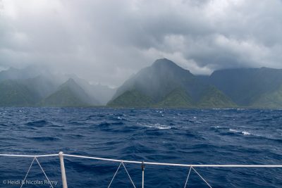 Derrière Moorea, Tahiti pointe le bout de son nez. Mais ce n’est vraiment que le bout du nez, parce qu’une première constatation s’impose d’emblée : Tahiti c’est grand ! De toutes les îles du Pacifique, c’est la première que nous abordons qu’il nous est impossible d’embrasser en entier du regard. Avec ses 32 milles de long sur 16 de large, et surtout ses 2’241 mètres d’altitude, Tahiti se coiffe de manière quasi-permanente d’une perruque de nuages. Evidemment, comparée à Chiloé, longue de 90 milles, ou à la Terre de Feu, qui dépasse les 200 milles de long, les dimensions n’ont rien de comparable. Mais nous sommes ici au milieu du Pacifique, et par rapport aux confettis volcaniques qui émergent ici ou là – parfois seulement à quelques mètres au-dessus de l’eau dans le cas des atolls – on comprend d’entrée de jeu l’importance de Tahiti en Polynésie. Cette importance, nous ne tardons pas à la voir en approchant, car elle se traduit par la taille démesurée de Papeete, la plus grande ville à presque 2’000 milles à la ronde.