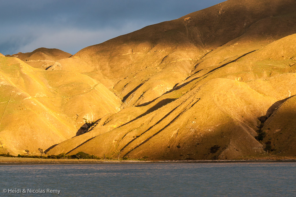 Les nuages sont cependant venus faire leur apparition, si bien que le plus souvent nous ne voyions que les pieds de la chaîne, ou certains sommets puis d’autres. Mais alors que le soleil déclinait, un peu de magie se produisit et nous fut dévoilée la chaîne dans son ensemble, rosissant au crépuscule. Descendant des sommets dorés, on pouvait apercevoir des glaciers, et parmi eux la longue langue du célèbre Fox Glacier. Les albatros virevoltaient encore devant cette toile de fond, tandis que les dauphins manquèrent un peu de ponctualité, ne venant danser devant le plus haut sommet de Nouvelle-Zélande qu’une fois la lumière trop faible pour pouvoir prendre des photos. Il n’empêche que ce soir là, nous avons-nous-même rayonné aussi, de bonheur, à la vue de ce spectacle qui n’est pas donné à beaucoup. Bien qu’éphémères, ces moments resteront longtemps gravés dans nos mémoires, marquées par tant de beauté et d’harmonie.