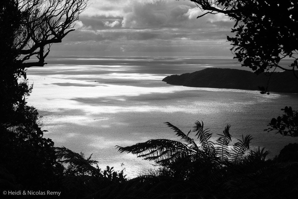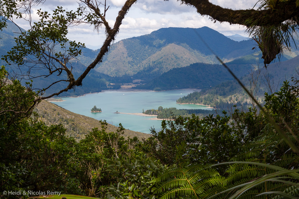 Et puis, comme le week-end tire déjà à sa fin, c’est l’heure des adieux, Mirabilis devant rependre le chemin de Wellington, tandis que nous nous enfonçons un peu plus profondément encore dans le Queen Charlotte Sound, toujours en attente d’une occasion de remonter vers le nord. Celle-ci se précise cependant pour le mercredi, et nous passons les deux jours qu’il nous reste dans la Mistletoe Bay, un endroit ici encore très joli, et même un peu mieux protégé, nous semble-t-il, que ceux plus vers le Détroit de Cook. C’est que lorsqu’on est non loin de cet entonnoir naturel, le vent peut véritablement souffler avec violence, tandis qu’en s’écartant un peu on sort véritablement du courant d’air, et nous sommes ainsi toujours abasourdis d’entendre les relevés de vent qui peuvent donner 40 nœuds dans le détroit et 5 à peine à Nelson, distante d’à peine 50 milles. Finalement, entre le relief, le soleil et le vent, cette côte a un peu un caractère méditerranéen ! Et la navigation se fait soit voiles arisées, soit au moteur, ici aussi comme en Méditerranée. Il fait d’ailleurs beau pour nos derniers jours dans les Sounds, et nous en profitons pour nous reposer après quelques nuits un peu agitées. Mais nous nous dégourdissons aussi les jambes, un superbe sentier permettant de rejoindre le Queen Charlotte Track et de gagner ensuite le sommet du Onahau Lookout. Le panorama y est peut-être le plus beau de ceux que nous avons vus dans les Sounds, avec des bras de mer de tous côtés. Sur l’autre versant de l’isthme de Te Mahia, c’est le Kenepuru Sound, distant de 70 milles par voie de mer, et d’1km à peine à pied ! Les marées, d’ailleurs, sont bien différentes d’un côté et de l’autre.