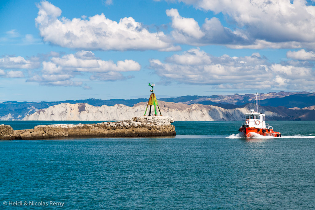 Un nom bien curieux et qui nous rappelle, tout comme les deux statues qui trônent de l’autre côté de la rivière, que Cook est passé par là. C’est même ici qu’il a mis le pied pour la première fois en Nouvelle-Zélande, et la deuxième statue est celle de Young Nick, le matelot qui a le premier aperçu la terre, le 7 octobre 1769. Premier débarquement, premier contact avec les Maoris, et premiers malentendus aussi, si bien que les navigateurs en mal de “rafraîchissements”, n’ont pas pu trouver de quoi ravitailler, donnant ainsi son nom à la baie. Pour nous, c’est un peu moins compliqué, bien qu’on ait du mal à trouver une boulangerie correcte, et il suffit de nous rendre chez Pak n’Save pour trouver légumes, fruits, viande et produits laitiers. On remplit le réservoir d’eau au port, et le club de pêche installé juste là nous permet d’utiliser gracieusement ses douches et sa connexion Internet ! En tous les cas, et même si les frais d’amarrage au port ne sont pas donnés, les habitants ont amélioré leur hospitalité depuis deux siècles !