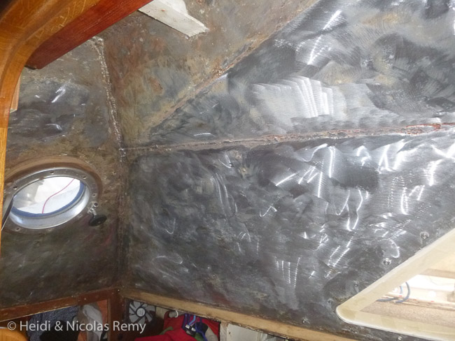 Refaire le revêtement intérieur en liège des toilettes, en commençant par arracher l’ancien. Décapage ensuite à la meuleuse, puis pose de nouveaux panneaux de liège ajustés, en profitant de cette occasion pour enlever et reposer le plexi bâbord et le hublot rond sur l’arrière. Saturation par la suite du liège pour le protéger de l’humidité. Enfin, refaire les finitions en découpant de nouvelles baguettes d’angle, ensuite vernies avec soin. Bref, vous l’aurez compris, nous avons maintenant des toilettes bien plus jolies. Il nous reste le lavabo à remplacer, l’actuel montrant des signes de faiblesse, mais impossible de trouver cela ici, alors nous l’avons commandé en Australie et il nous y attendra lors de notre passage.
