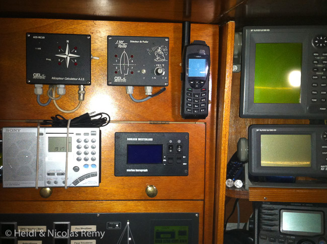 Et puis, il nous faut encore mettre à jour de notre équipement de sécurité. En effet, d’une part, notre immobilisation ces deux dernières années a fait que nous avons atteint certaines dates de péremption ou de révision nécessaire. Et d’autre part, la réglementation française a changé avec effet au 1er mai 2015, et il nous faut donc mettre Fleur de Sel en conformité avec ces nouvelles règles, au risque sinon de nous voir verbaliser lorsque l’administration française (au côté tatillon célèbre) ne manquera pas de nous contrôler. Nous avons donc fait réviser les extincteurs, ce qui nous donnera une année de plus, mais il nous faudra ensuite en trouver des nouveaux car ils commencent à être bien oxydés. De même nous avons fait réviser notre balise de détresse, car il était temps, et de plus c’est un équipement qui devient obligatoire pour faire de la navigation hauturière. Regardons le côté positif de la chose : les moyens obligatoires à bord pour signaler une détresse deviennent modernes, avec VHF et balise obligatoires, tandis que les anciens moyens peu efficaces, dangereux et polluants sont abandonnés, à savoir les fusées. Reste à savoir comment nous allons réussir à recycler celles que nous conservons pour l’instant à bord bien qu’elles soient périmées…