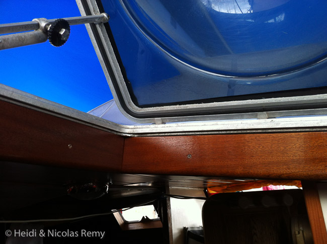 Réalisation de cadres intérieurs en menuiserie pour nos panneaux de pont. Pour la bulle ça n’a pas été trop difficile, mais pour le panneau avant il nous fallait le faire sans angle droit, un petit challenge supplémentaire. Mais ça y est, c’est poncé, vernis, installé, et ça rend bien !
