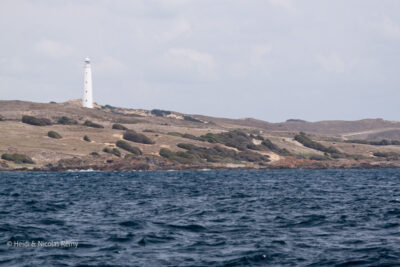 La météo, avec un vent de sud tournant à l’est, semble parfaite pour nous permettre de sortir du détroit et pour poursuivre notre route vers l’ouest. La marée aussi est avec nous, avec un courant parfaitement synchronisé pour permettre une remontée de la côte est. La sortie du port est un peu rude, mais le reste se présente bien jusqu’à ce qu’une fois encore nous nous fassions envelopper dans la fumée. Les incendies brûlent encore à l’heure où je vous écris, dix jours après, et presque 4 semaines après les impacts de foudre initiaux, et ce sont pratiquement 100’000 hectares qui sont partis en fumée au total. Mais ce jour là, donc, alors que le vent tournait, nous nous sommes retrouvés sous le vent de la Tasmanie. La visibilité est tombé à quelques centaines de mètres tout au plus, et rapidement nos gorges ont commencé à être irritées. Pourtant, nous étions à 200km des incendies les plus proches ! Nous avons donc rallumé le radar et viré Councillor Island à moins d’un demi-mille sans jamais la voir. Ce n’est qu’à la faveur de la saute de vent suivante, alors que nous approchions du nord de l’île, que l’air s’est subitement éclairci à notre plus grand soulagement ! Nous avons ainsi pu voir la pointe nord de l’île, le Cape Wickham, pour un ultime adieu à la fois à King Island et à l’état de Tasmanie. Les Australiens affirment que le phare qui trône sur le cap est le plus haut de l’hémisphère sud, et il faut avouer qu’ils adorent dire que ceci ou cela est le “biggest, tallest or largest in the Southern hemisphere”. Rétablissons cependant la vérité, au moins un phare brésilien et deux phare argentins le dépassent largement, et même le Phare Amédée au large de Nouméa culmine à 8m de plus que lui. Néanmoins, avec ses 48m de haut, le phare du Cape Wickham reste le plus haut d’Australie, et du haut de ses collines d’herbe jaune, c’est comme un bel adieu qui nous est proposé.