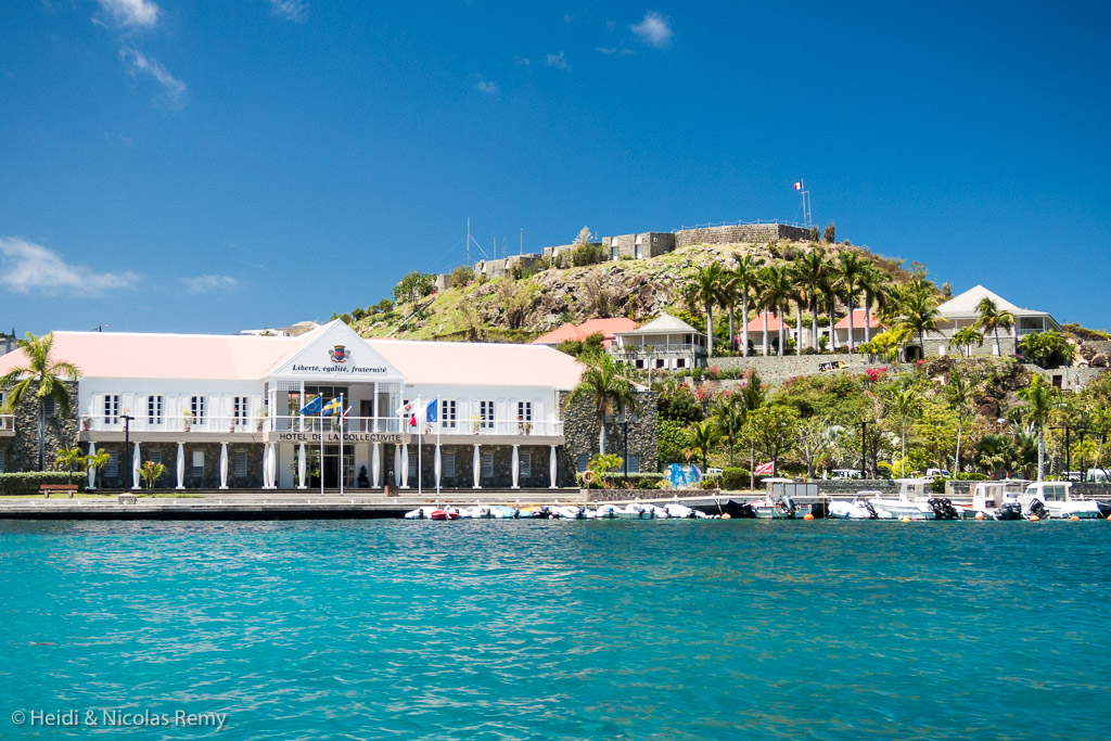 Une fois le mauvais temps passé, nous revenons mouiller plus près de Gustavia, et à défaut de visiter le reste de l’île, nous en profitons pour arpenter la petite ville qui a bien du cachet. L’île ayant appartenu aux Suédois pendant un siècle, on comprend mieux son nom, mais aussi son caractère. Certains vieux bâtiments sont manifestement d’architecture scandinave, les vieux noms de rue suédois sont conservés aux côtés des nouveaux noms de rue français, et il y a même un consulat de Suède ! Les anciens forts qui défendaient le port ont des noms évocateurs (Karl, Oscar, Gustav) et ils permettent d’embrasser un panorama magnifique. Le bourg est propret, huppé et branché sans tomber (trop) dans l’excès. Les gens y sont plutôt agréables, courtois et serviables. Bref, le temps de notre rapide escale, on s’y sent bien. Mais il faut vraiment que ça ne bouge pas trop dehors car on doit mouiller sur rade à un endroit qui peut vite devenir inconfortable.