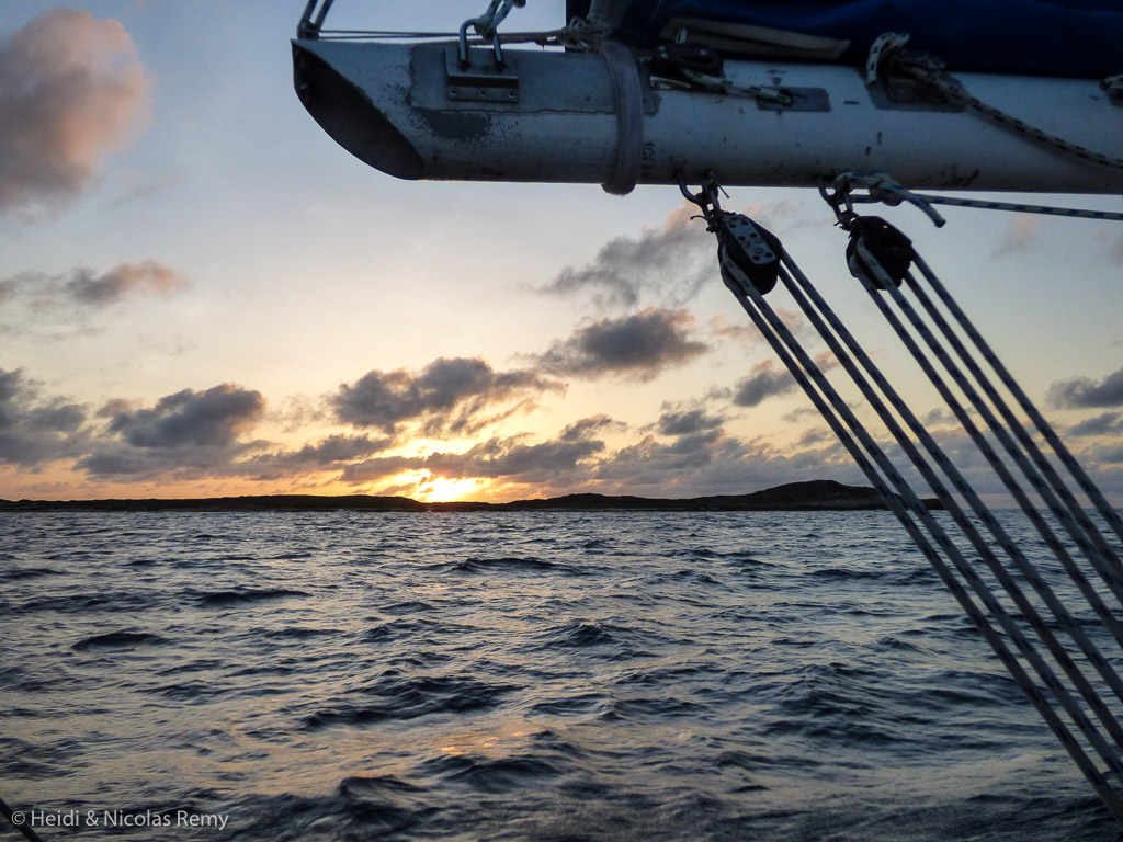 Fleur de Sel lève l’ancre, trois semaines et demie après l’arrivée aux Antilles, et nous filons cap au nord. Presque immédiatement, nous laissons sous le vent l’Ile Fourchue, bien nommée en raison de sa forme tarabiscotée. Puis plus loin c’est la grande île de St-Martin que nous passons à plus grande distance, avec la petite Ile Tintamarre. Et nous nous octroyons encore un tout petit peu de tourisme antillais, le temps d’apercevoir Anguilla (sans nous y arrêter). Pour plus d’amusement, nous choisissons de passer dans l’étroit passage entre l’île principale et Scrub Island. C’est étonnant, car les deux îles sont plates au possible et n’ont rien à voir avec les hautes collines de St-Martin ou de St-Barth. Chacune de ces îles antillaises a ainsi sa propre personnalité, et elles sont certainement chacune intéressantes à découvrir. Mais nous n’avons pas le temps. Et elles partagent toutes quelque chose en commun : elles sont très peuplées vu leurs tailles. La plupart d’entre elles étant aussi peuplées de touristes et de yachties, nous n’avons pas besoin d’en voir beaucoup plus. D’ailleurs, nous avons déjà tourné la page et nous regardons devant nous, dans l’Atlantique Nord.