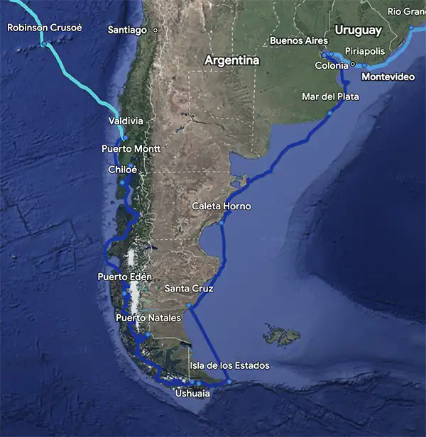 2010-2011 : Entre une bonne escale à Buenos Aires et un long arrêt à Valdivia, le temps d’aller en bus dans les Andes, nous passons cinq mois en Patagonie. Trajet détaillé dans les canaux chiliens ici au format GPX.