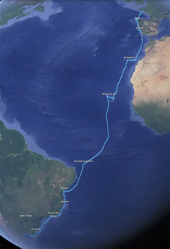 2010 : Après cinq longs mois de travaux intensifs à bord, nous quittons La Trinité-sur-Mer avant l’arrivée du printemps pour descendre l’Atlantique en diagonale, via Canaries, Cap-Vert, Brésil et Uruguay.