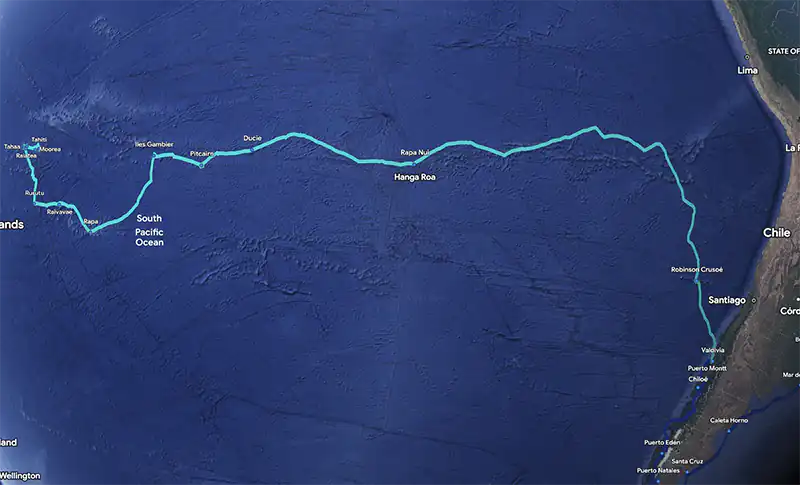 2011 : Traversée du Pacifique Est, via l’Ile de Pâques, sans réussir à s’arrêter à Pitcairn, et en commençant notre exploration de la Polynésie Française avec les Gambier et les Australes. De Tahiti, nous revenons en Europe pour les Fêtes.